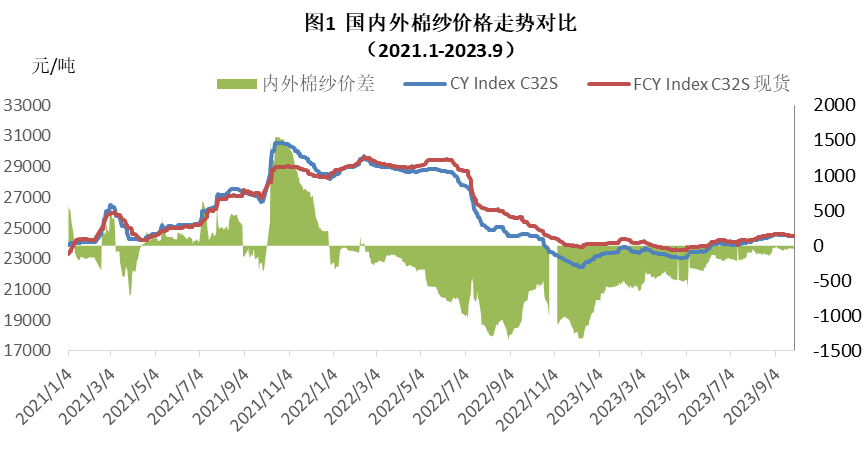本月內外棉紗價格均上漲,國產(chǎn)32支純棉紗9月均價24524元/噸,較上月上漲198元,漲幅0.81%,較去年同期下跌12元,跌幅0.05%;進口32支純棉紗9月均價24570元/噸,較上月上漲140元,漲幅0.57%,較去年同期下跌986元,跌幅3.86%。