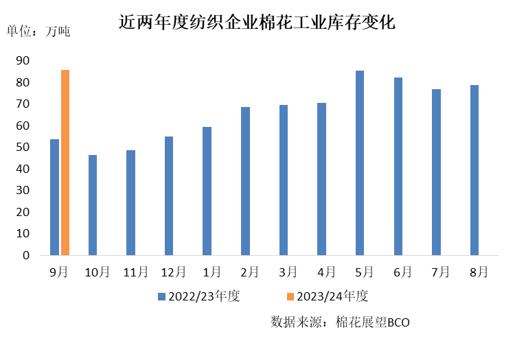 臨近新棉上市,紡織廠積極參與儲備棉競拍,同時前期訂購進口棉逐步提貨,月內原料庫存有所增加。截至9月30日,紡織廠在庫棉花工業(yè)庫存量85.71萬噸,環(huán)比增加6.87萬噸,同比增加32.15萬噸。其中26%企業(yè)減少棉花庫存,38%增加庫存,46%基本保持不變。