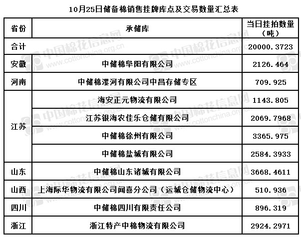中國儲備棉管理有限公司定于10月25日通過全國棉花交易市場上市銷售儲備棉重量20000.3723噸,共61捆。具體庫點及數(shù)量見下表。