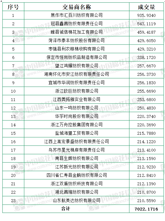 新疆棉成交均價16608元/噸,較前一日下跌29元/噸,新疆棉折3128價格17253元/噸,較前一日持平,新疆棉平均加價幅度上漲58元/噸。