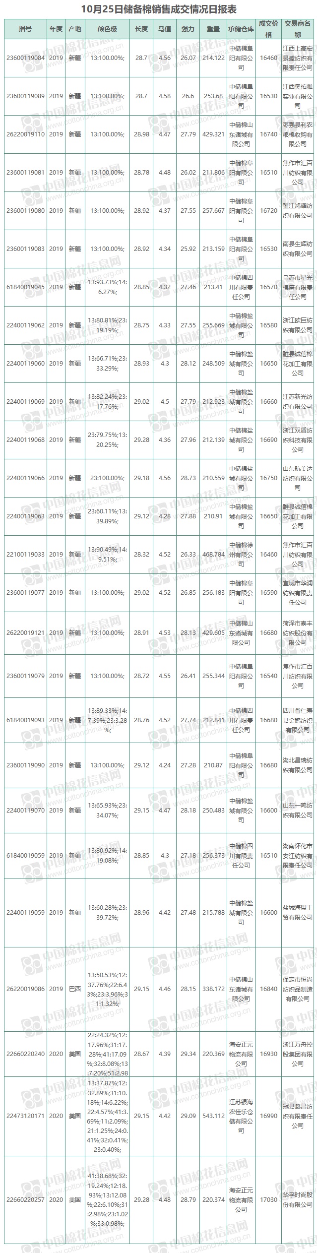10月25日儲備棉銷售資源20000.3723噸,實際成交7022.1716噸,成交率35.11%,成交均價16672元/噸,較前一日下跌69元/噸,折3128價格17277元/噸,較前一日下跌2元/噸。