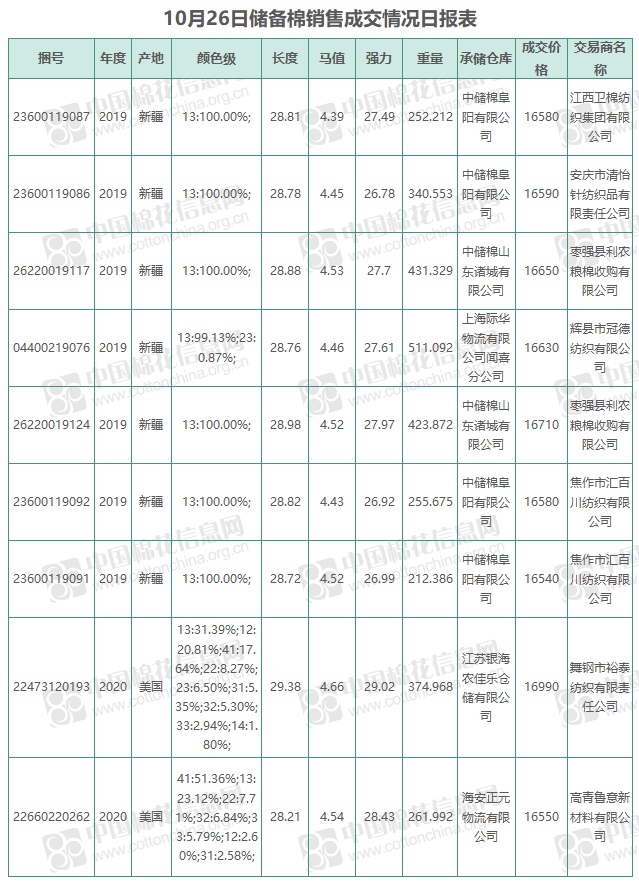 10月26日儲(chǔ)備棉銷售資源20002.154噸,實(shí)際成交3064.08噸,成交率15.32%,成交均價(jià)16662元/噸,較前一日下跌10元/噸,折3128價(jià)格17241元/噸,較前一日下跌36元/噸。