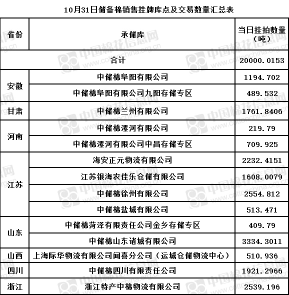 中國儲(chǔ)備棉管理有限公司定于10月31日通過全國棉花交易市場上市銷售儲(chǔ)備棉重量20000.0153噸,共65捆。具體庫點(diǎn)及數(shù)量見下表。