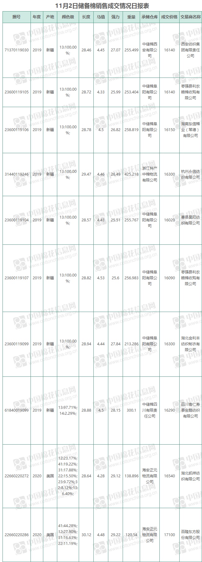 11月2日儲備棉銷售資源20001.7148噸,實際成交2478.512噸,成交率12.39%,成交均價16252元/噸,較前一日下跌73元/噸,折3128價格16869元/噸,較前一日上漲24元/噸。