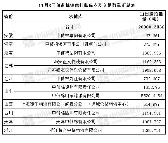 中國儲備棉管理有限公司定于11月3日通過全國棉花交易市場上市銷售儲備棉重量20000.3836噸,共52捆。具體庫點及數(shù)量見下表。