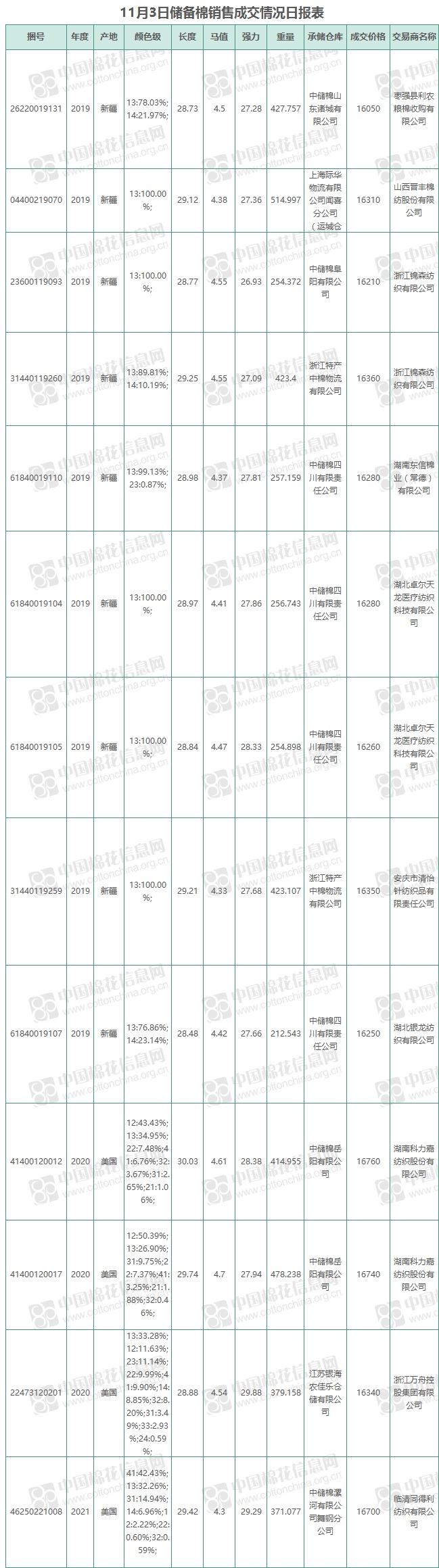 11月3日儲備棉銷售資源20000.3836噸,實際成交4668.404噸,成交率23.34%,成交均價16398元/噸,較前一日上漲146元/噸,折3128價格16869元/噸,較前一日持平。