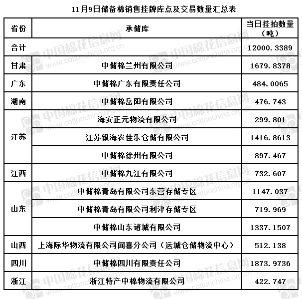 中國儲備棉管理有限公司定于11月9日通過全國棉花交易市場上市銷售儲備棉重量12000.3389噸,共46捆。具體庫點及數(shù)量見下表。