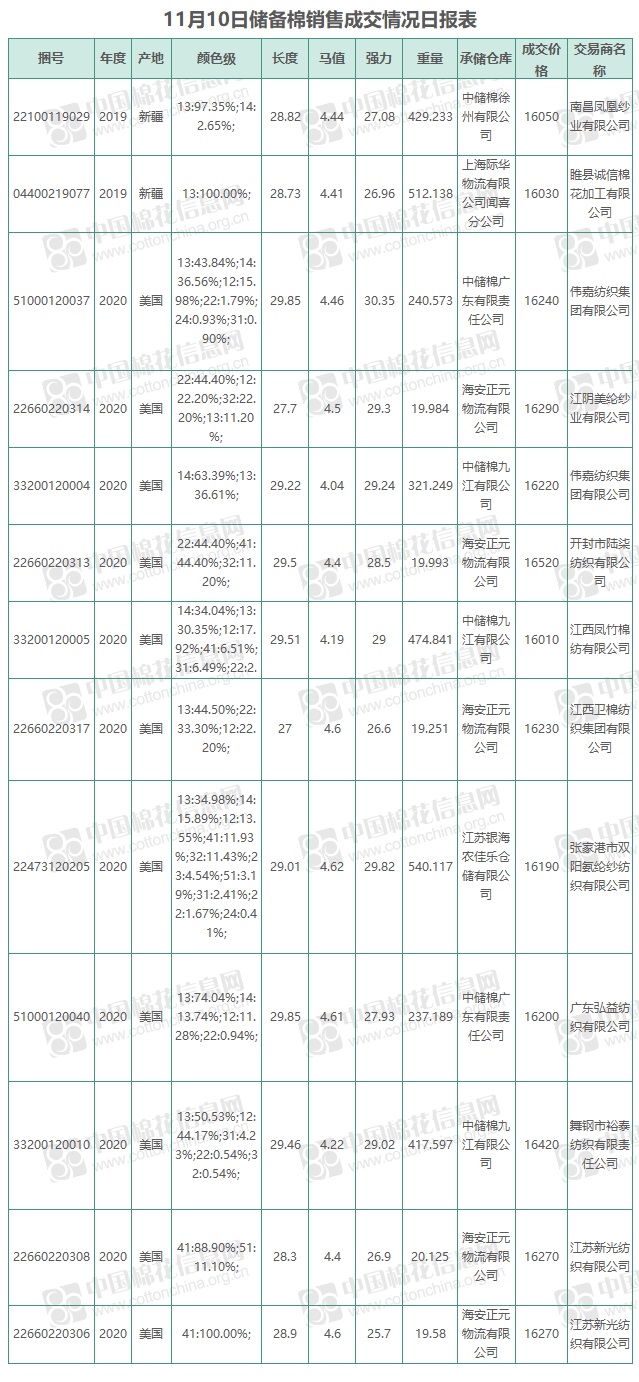 11月10日儲備棉銷售資源12001.1177噸,實(shí)際成交3271.8708噸,成交率27.26%,成交均價(jià)16161元/噸,較前一日持平,折3128價(jià)格16704元/噸,較前一日上漲14元/噸。