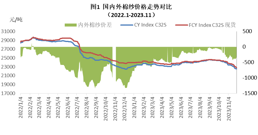 本月內(nèi)外棉紗價(jià)格均下跌,國產(chǎn)32支純棉紗11月均價(jià)23104元/噸,較上月下跌1018元,跌幅4.2%,較去年同期上漲109元,漲幅0.5%;進(jìn)口32支純棉紗11月均價(jià)23256元/噸,較上月下跌1056元,跌幅4.3%,較去年同期下跌809元,跌幅3.4%。