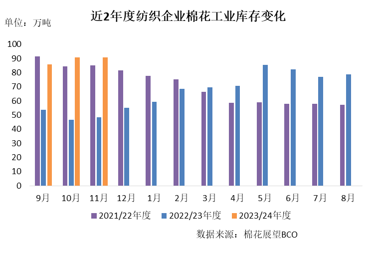 紡織廠在成品庫存高企及銷售虧損下,經(jīng)營壓力持續(xù)增加,原料采購偏謹(jǐn)慎,隨用隨買,月內(nèi)原料庫存基本維持前期水平。截至11月30日,紡織廠在庫棉花工業(yè)庫存量90.7萬噸,環(huán)比基本持平,同比高42.2萬噸。其中34%企業(yè)減少棉花庫存,29%增加庫存,37%基本保持不變。