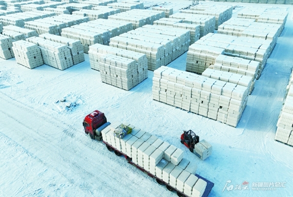 1月11日,在位于兵團第七師胡楊河市的新疆中錦胡楊河倉儲物流有限公司貨場,一輛貨車在裝載棉包,準備發(fā)往山東等地(無人機攝)。該貨場是鄭州商品交易所指定棉花交割倉儲庫,年倉儲量可達15萬噸。截至目前,已入庫新棉超9萬噸。