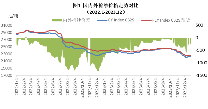 12月,內(nèi)外棉紗價(jià)格均下跌,國(guó)產(chǎn)32支純棉紗均價(jià)22227元/噸,環(huán)比下跌877元,跌幅3.8%,同比下跌109元,跌幅2.3%;進(jìn)口32支純棉紗均價(jià)22589元/噸,環(huán)比下跌667元,跌幅2.9%,同比下降1298元,跌幅5.4%。