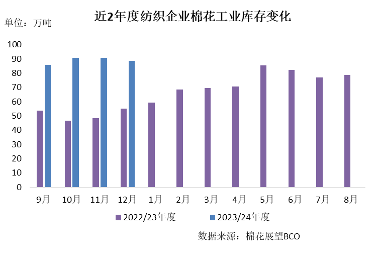 12月,紡織下游出現(xiàn)階段性好轉(zhuǎn),但企業(yè)利潤(rùn)改善有限,原料采購(gòu)仍偏謹(jǐn)慎,棉花庫(kù)存穩(wěn)中有降。截至12月31日,紡織廠在庫(kù)棉花工業(yè)庫(kù)存量88.7萬(wàn)噸,環(huán)比減少2萬(wàn)噸,同比高33.5萬(wàn)噸。其中37%企業(yè)減少棉花庫(kù)存、28%增加庫(kù)存、35%基本保持不變。