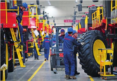 在新疆缽施然智能農(nóng)機(jī)股份有限公司采棉機(jī)生產(chǎn)車間,工人安裝采棉機(jī)輪胎(2月28日攝)。2024年該公司針對新疆產(chǎn)棉區(qū)批量生產(chǎn)3行可變形打包采棉機(jī)和4行打包采棉機(jī)等新品。