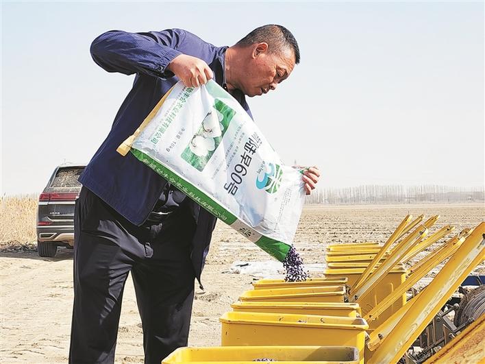 4月20日,八師一四四團(tuán)八連棉花播種現(xiàn)場,職工為精量播種機(jī)添加棉種。今年一四四團(tuán)計(jì)劃種植棉花30.6萬畝,全部采用北斗導(dǎo)航精量播種、干播濕出、膜下滴灌等技術(shù),做到播完一塊、布管一塊、滴水一塊,提升棉花播種質(zhì)量和效率。