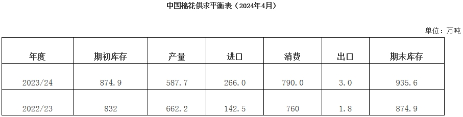 1季度,我國國民經(jīng)濟延續(xù)回升向好態(tài)勢,開局良好。3月國內(nèi)棉花市場供應(yīng)充足,進口量持續(xù)大幅增加,棉價震蕩下行。受氣溫偏低等因素影響,春季訂單推遲,國內(nèi)市場需求不足,紡織品服裝出口不及預(yù)期,旺季不旺特征明顯,企業(yè)采購原料謹慎。中國棉花協(xié)會預(yù)測2023/24年度全國棉花產(chǎn)量587.7萬噸,同比下降11.3%;棉花進口量266萬噸,同比增長86.7%,較上期上調(diào)56萬噸;消費量790萬噸,同比增長4%;期末庫存相應(yīng)調(diào)整為935.6萬噸,同比增長6.9%。3月下旬以來,隨著天氣逐漸轉(zhuǎn)暖,棉花播種陸續(xù)展開,據(jù)中國棉花協(xié)會調(diào)查:全國植棉意向面積4112萬畝,同比下降1.5%,降幅與上期持平。