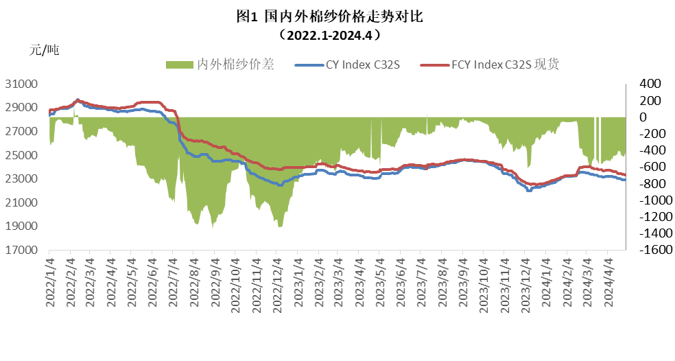 本月內(nèi)外棉紗價(jià)格均下跌,國(guó)產(chǎn)32支純棉紗4月均價(jià)23071元/噸,環(huán)比下跌269元/噸,跌幅1.2%,同比下跌65元/噸,跌幅0.3%;進(jìn)口32支純棉紗4月均價(jià)23541元/噸,環(huán)比下跌332元/噸,跌幅0.2%。