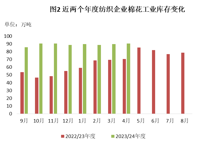 本月紡織廠原料采購(gòu)以剛需補(bǔ)庫(kù)為主,棉企也有一定讓價(jià)以促進(jìn)成交。截至4月30日,紡織廠在庫(kù)棉花工業(yè)庫(kù)存量90.6萬(wàn)噸,環(huán)比增加0.7萬(wàn)噸,同比增加20.1萬(wàn)噸。其中:30%企業(yè)減少棉花庫(kù)存,34%增加庫(kù)存,36%基本保持不變。