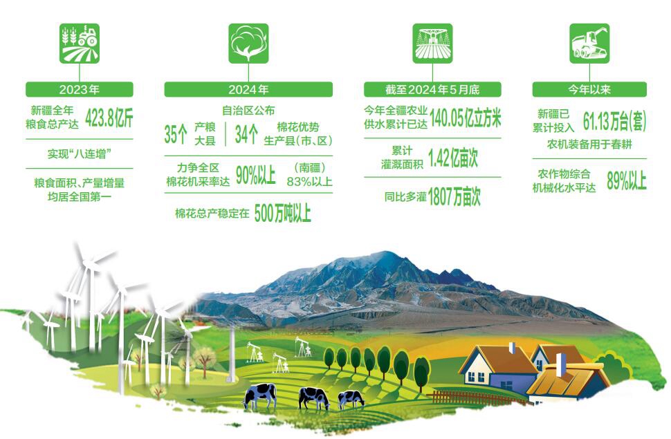 當(dāng)然,增產(chǎn)目標(biāo)建立在科學(xué)判斷基礎(chǔ)之上。數(shù)據(jù)顯示,2023年新疆全年糧食總產(chǎn)達(dá)423.8億斤,實現(xiàn)“八連增”,糧食面積增量、產(chǎn)量增量均居全國第一,占全國增量6成以上;作為國家優(yōu)質(zhì)商品棉基地,棉花種植面積、總產(chǎn)、單產(chǎn)均居全國首位。