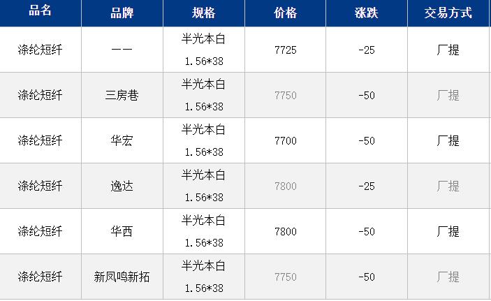 江蘇滌綸短纖現(xiàn)貨價(jià)格下跌25元在7725元/噸?;て氛w氛圍偏弱拖累市場(chǎng)氣氛,上午PTA-PF期貨弱勢(shì)下跌,部分供應(yīng)商略松動(dòng)出貨;但主流工廠價(jià)格依舊堅(jiān)挺穩(wěn)定;目前工廠價(jià)格穩(wěn)于8000元/噸自提,貿(mào)易商一口價(jià)7750元/噸附近自提,部分外庫(kù)貨源7650元/噸。