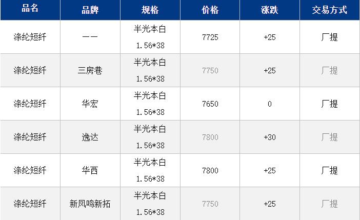 江蘇滌綸短纖現(xiàn)貨價(jià)格上漲25元在7725元/噸。成本上漲帶動(dòng)短纖價(jià)格略有小漲,目前工廠價(jià)格7900元/噸自提,貿(mào)易商一口價(jià)7700-7800元/噸自提,部分外庫貨源7650元/噸附近。
