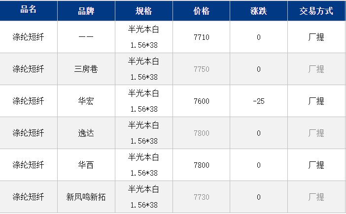 江蘇滌綸短纖現(xiàn)貨價(jià)格穩(wěn)定在7710元/噸。原油及成本表現(xiàn)偏弱,但短纖工廠挺價(jià)延續(xù),貿(mào)易商出貨謹(jǐn)慎,價(jià)格變動(dòng)不大;目前工廠價(jià)格維持7900元/噸附近自提,貿(mào)易商一口價(jià)7700-7750元/噸自提,偏高7800元/噸,偏低7600元/噸。