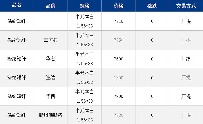 江蘇滌綸短纖現(xiàn)貨價格穩(wěn)定7710元/噸。上下游現(xiàn)貨表現(xiàn)一般;但國際油價仍有上漲,且短纖工廠挺價情緒仍存,目前江蘇滌綸短纖價格暫穩(wěn)。目前工廠價格維持7900元/噸附近自提,貿(mào)易商一口價7700-7750元/噸自提,偏高7800元/噸,偏低7580元/噸附近。