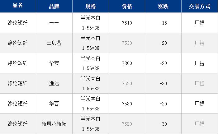 1.4D半光直紡滌綸短纖江浙商談重心7300-7650元/噸出廠或短送,福建7500-7650元/噸附近短送,山東、河北主流7400-7750元/噸送到。