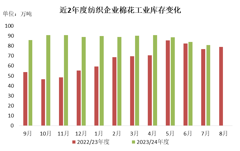紡織廠開機(jī)率低位運(yùn)行,棉紗銷售遲緩,用棉量減少,國內(nèi)棉價(jià)雖下跌,但企業(yè)補(bǔ)庫意愿不強(qiáng),原料庫存有所下降。截至7月31日,紡織廠在庫棉花工業(yè)庫存量80.7萬噸,環(huán)比減少3.1萬噸,同比增加3.85萬噸。其中:41%企業(yè)減少棉花庫存,26%增加,33%基本保持不變。