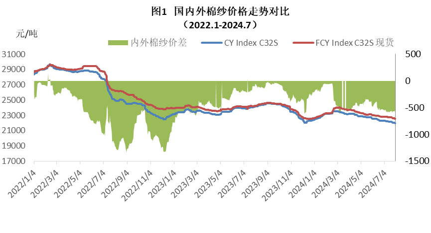 7月,內(nèi)外棉紗價(jià)格均下跌。國產(chǎn)32支純棉紗均價(jià)22158元/噸,較上月下跌271元,跌幅1.2%,同比下跌1818元,跌幅7.6%;進(jìn)口32支純棉紗7月均價(jià)22726元/噸,環(huán)比下跌179元/噸,跌幅0.8%,同比下跌1415元,跌幅5.9%。