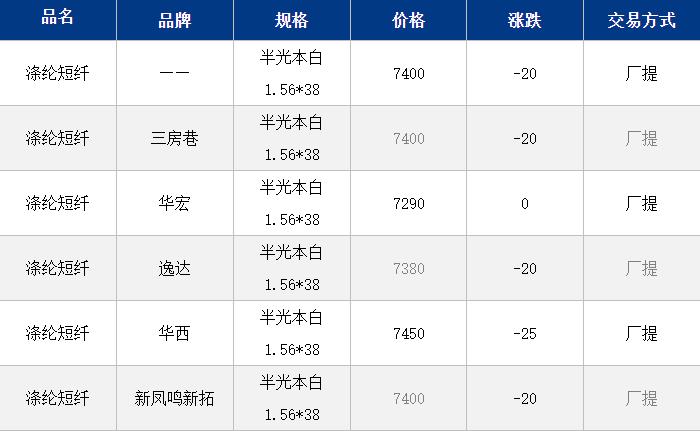 1.4D半光直紡滌綸短纖江浙商談重心7250-7550元/噸出廠或短送,福建7500-7600元/噸附近短送,山東、河北主流7350-7600元/噸送到。