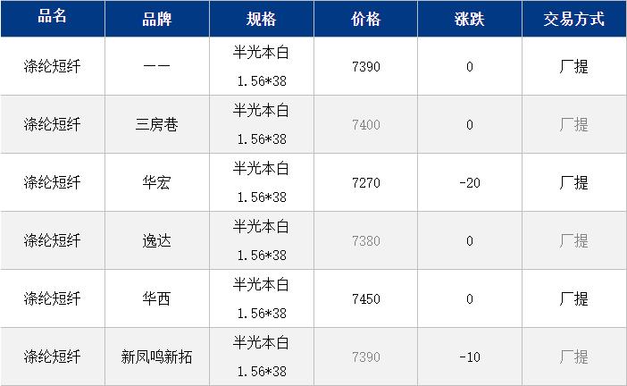 1.4D半光直紡滌綸短纖江浙商談重心7250-7550元/噸出廠或短送,福建7450-7550元/噸附近短送,山東、河北主流7350-7600元/噸送到。