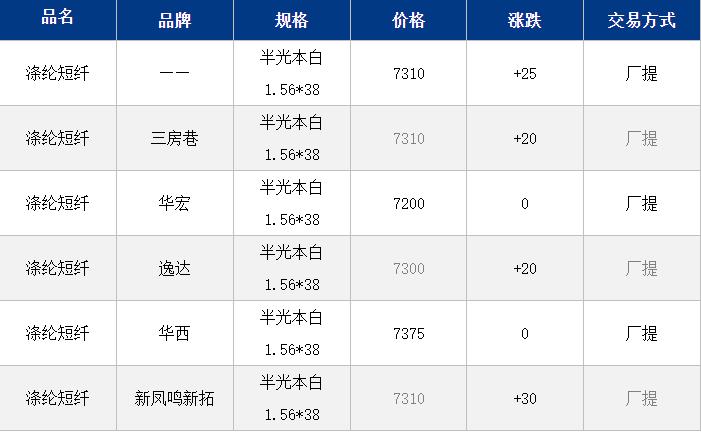 1.4D半光直紡滌綸短纖江浙商談重心7100-7450元/噸出廠或短送,福建7300-7450元/噸附近短送,山東、河北主流7250-7500元/噸送到。