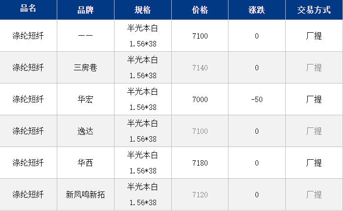 江蘇滌綸短纖現(xiàn)貨價(jià)格暫時(shí)穩(wěn)定在7100元/噸;原油上漲對成本提振有限,短纖價(jià)格暫時(shí)穩(wěn)定整理;目前工廠價(jià)格7200-7250元/噸自提,貿(mào)易商一口價(jià)7100-7150元/噸自提,偏低7000元/噸附近。