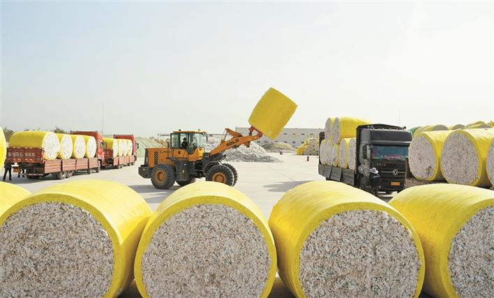10月14日,新疆朋匯棉業(yè)有限公司工人駕駛機(jī)車(chē)搬運(yùn)棉包。今年,該公司計(jì)劃收購(gòu)籽棉3萬(wàn)噸,加工皮棉1.1萬(wàn)噸。目前,二師鐵門(mén)關(guān)市30多家棉花加工企業(yè)均已開(kāi)秤收購(gòu)新棉。