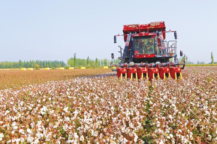 眼下正值棉花采收期。在阿克蘇地區(qū)各地,一臺(tái)臺(tái)采棉機(jī)在棉田穿梭作業(yè),成為一道亮麗風(fēng)景線。