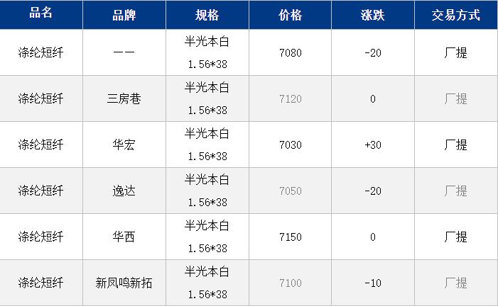 1.4D半光直紡滌綸短纖江浙商談重心7000-7250元/噸出廠或短送,福建7200-7350元/噸附近短送,山東、河北主流7100-7350元/噸送到。