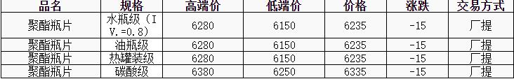 華東聚酯瓶片價格下跌15元至6235元/噸,原油拖累原料下行,聚酯瓶片工廠報價下調(diào)20-60元/噸,市場重心隨之下滑。10-11月貨源報盤6150-6280或期貨合約03升水50-70,遞盤6200-6220,業(yè)內(nèi)情緒偏謹(jǐn)慎,買氣偏弱。
