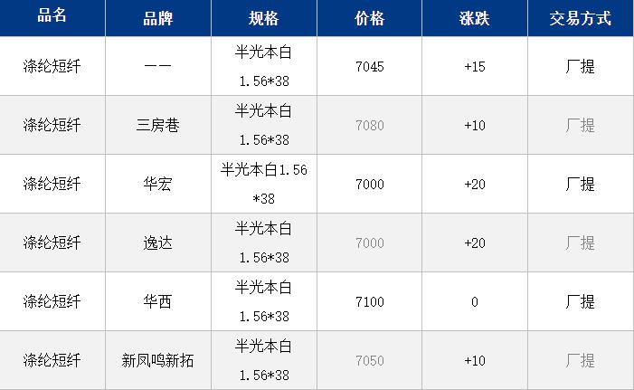 1.4D半光直紡滌綸短纖江浙商談重心6900-7150元/噸出廠或短送,福建7100-7200元/噸附近短送,山東、河北主流7000-7250元/噸送到。