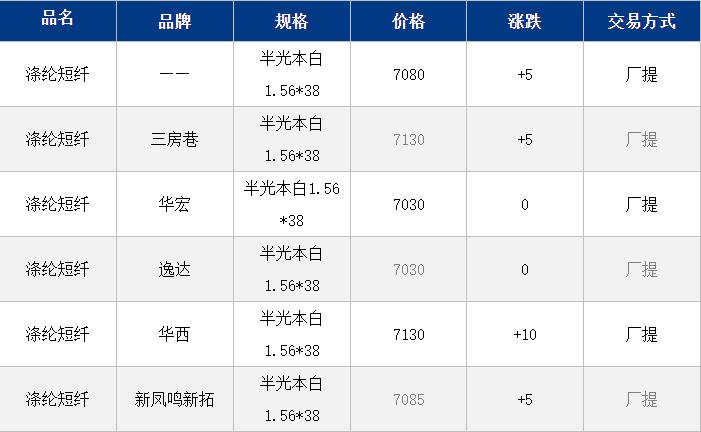 1.4D半光直紡滌綸短纖江浙商談重心6950-7150元/噸出廠或短送,福建7150-7200元/噸附近短送,山東、河北主流7050-7250元/噸送到。