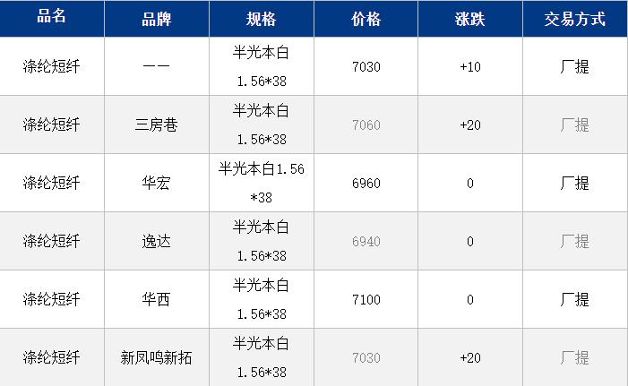 1.4D半光直紡滌綸短纖江浙商談重心6950-7150元/噸出廠或短送,福建7150-7200元/噸附近短送,山東、河北主流7100-7300元/噸送到。