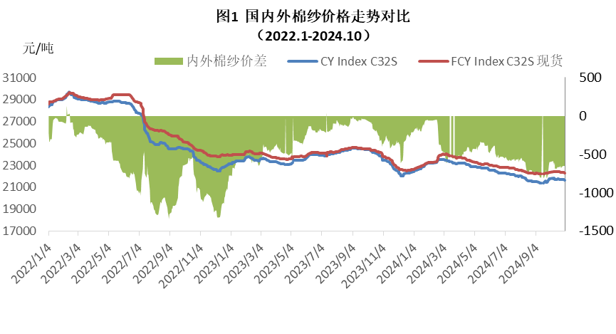 本月內(nèi)外棉紗價格均價上漲,國產(chǎn)32支純棉紗均價21717元/噸,環(huán)比上漲222元,漲幅1%,同比下跌2443元,跌幅10.1%;進口32支純棉紗10月均價22368元/噸,環(huán)比上漲112元,漲幅0.5%,同比下跌1964元,跌幅8.1%。