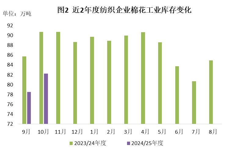 月內(nèi)隨著新棉加工逐步增加,性價比高的現(xiàn)貨資源得到補充,紡織廠逢低補庫,總體原料庫存小幅上升。截至10月31日,紡織廠在庫棉花工業(yè)庫存量82.3萬噸,環(huán)比增加3.8萬噸,同比減少8.4萬噸。其中:34%企業(yè)增加棉花庫存,27%減少庫存,39%基本保持不變。
