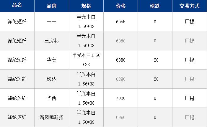 1.4D半光直紡滌綸短纖江浙商談重心6900-7100元/噸出廠或短送,福建7000-7100元/噸附近短送,山東、河北主流6950-7150元/噸送到。