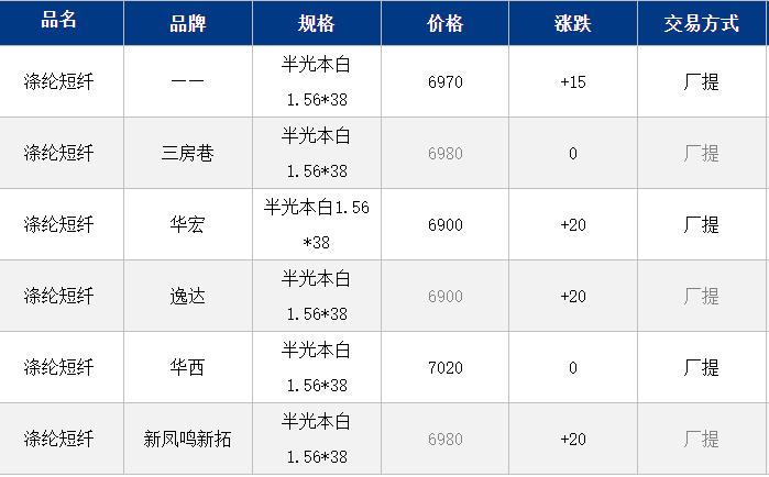 江蘇滌綸短纖現(xiàn)貨價格上漲15元到6970元/噸。目前工廠價格維持7000-7050元/噸自提,偏高7100元/噸;貿易商一口價多在6960-6990元/噸自提,偏低6880附近,基差部分品牌02+80到+120。