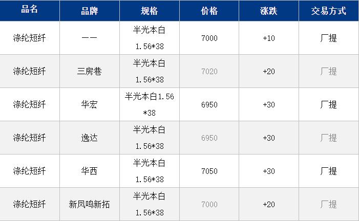 江蘇滌綸短纖現(xiàn)貨價格上漲10元到7000元/噸。成本上漲推動下,上午部分企業(yè)報價上調(diào)50元/噸,目前工廠價格7000-7100元/噸自提;貿(mào)易商一口價多在7000-7020元/噸自提,偏低6950元/噸附近。