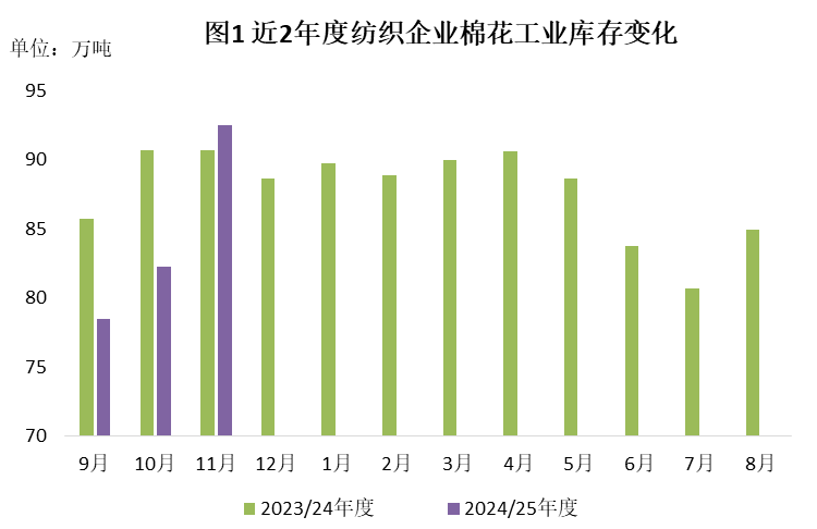 月內(nèi)隨著新棉加工持續(xù)進行,性價比高的現(xiàn)貨資源得到補充,紡織廠逢低補庫,原料庫存小幅上升。截至11月30日,紡織廠在庫棉花工業(yè)庫存量為92.5萬噸,環(huán)比增加10.3萬噸,同比增加1.8萬噸。其中36%企業(yè)增加棉花庫存,24%減少庫存,40%基本保持不變。