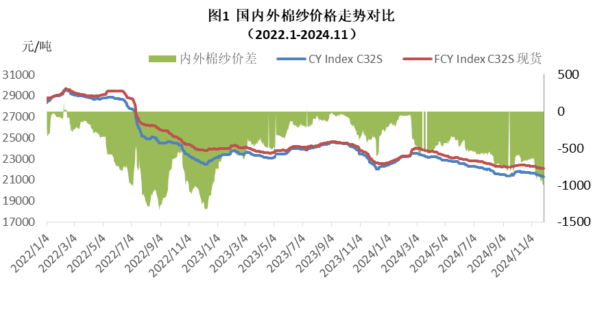 本月內(nèi)外棉紗價格均價下跌,國產(chǎn)32支純棉紗11月均價21495元/噸,環(huán)比下跌222元,跌幅1.02%,同比下跌1624元/噸,跌幅7%;進口32支純棉紗11月均價22186元/噸,環(huán)比下跌182元,跌幅0.8%,同比下跌1281元,跌幅5.5%。