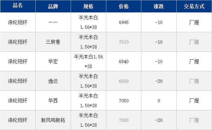 1.4D半光直紡滌綸短纖江浙商談重心6900-7150元/噸出廠或短送,福建7100-7150元/噸附近短送,山東、河北主流7000-7200元/噸送到。