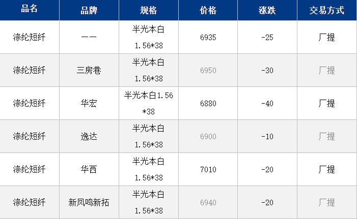 1.4D半光直紡滌綸短纖江浙商談重心6850-7100元/噸出廠或短送,福建7050-7150元/噸附近短送,山東、河北主流6950-7150元/噸送到。